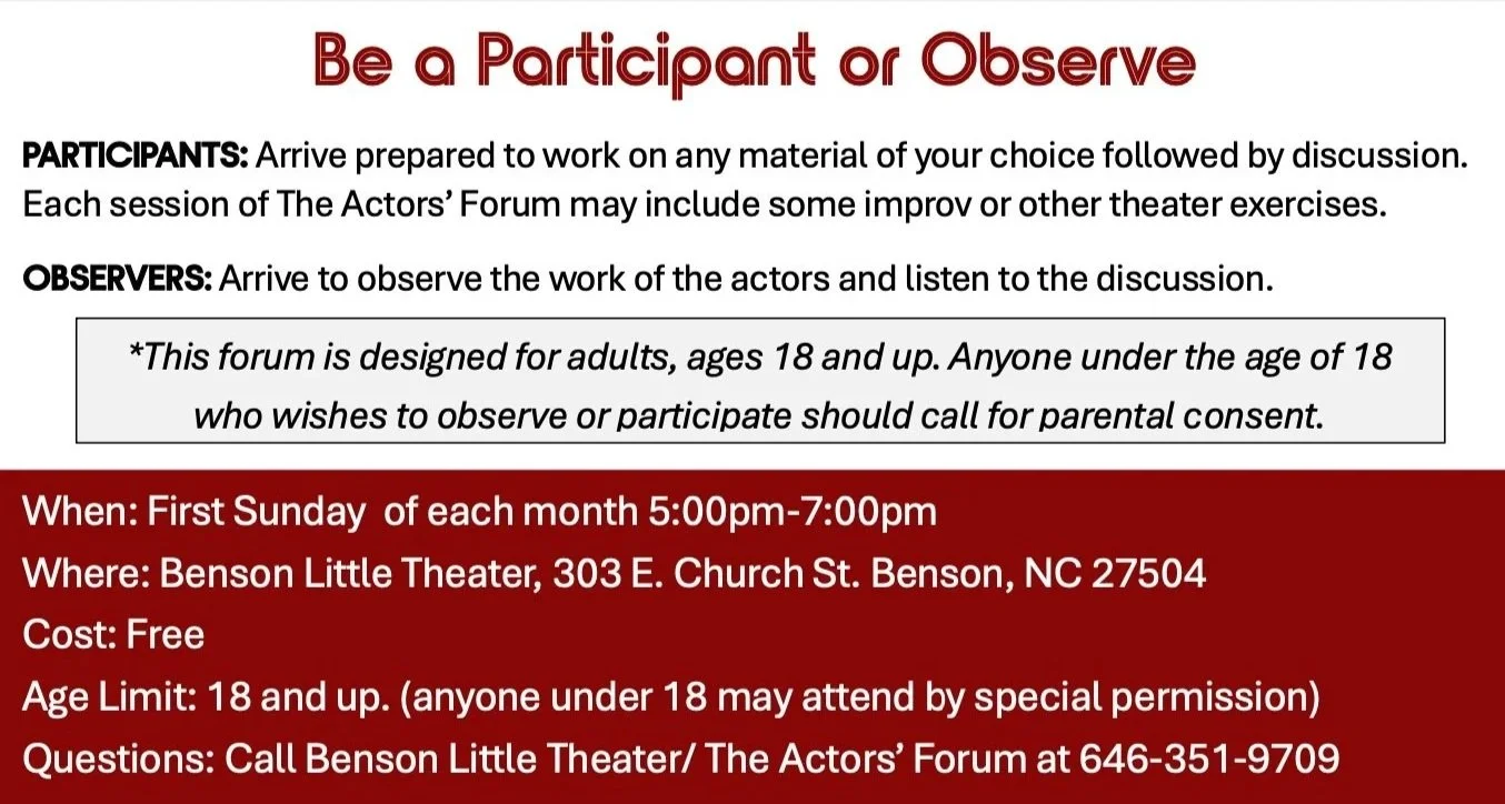 At The Actors’ Forum we invite actors to come in and work on the material of their choice - MONOLOGUES, SCENES, SONGS, or AUDITION MATERIAL. Discussions will yield positive, constructive, and professional feedback. The Actors’ Forum will provide discovery of new skills and techniques while bringing joy and confidence to the craft of acting. All adult actors are welcome to attend and practice their craft!